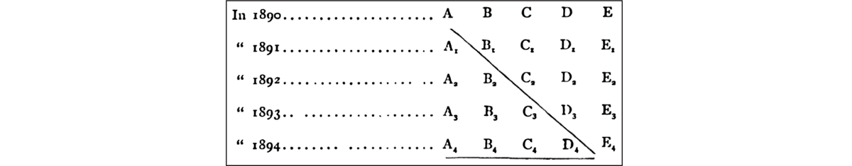 [t]he workers E4 cannot be completing the material which A4 are bringing forth at the same time…E4 must be at work on products which came from D of an earlier period, say the D3 of 1893; D3 got them, partly advanced toward completion, from C2 of 1892; the first steps were taken five years ago by A1 of 1890. The diagonal line marks the labor which yields the enjoyable commodities of 1895—labor mainly of the past, and only in small part of the present.